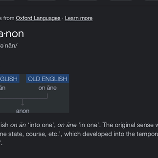 Anon = Anonymous but it also means "In short time", "Into One" or "Into One State/Course", and it also means "In One" or "Right Away".